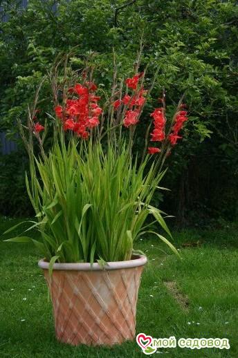 Полив. Средняя частота поливов культуры составляет раз в неделю, а летом, в жаркие дни, один раз в 3-4 суток. Поливают утром или вечером, используя около 10-12 л воды на 1 м2. Полив производят в специально подготовленные междурядные борозды, углублённые до 30-50 мм с тем, чтобы капли воды не попадали на листики гладиолусов. Без регулярного полива цветы быстро завянут. По завершении процедуры кусты окучивают. Раз в декаду обязательно производят рыхление почвы.